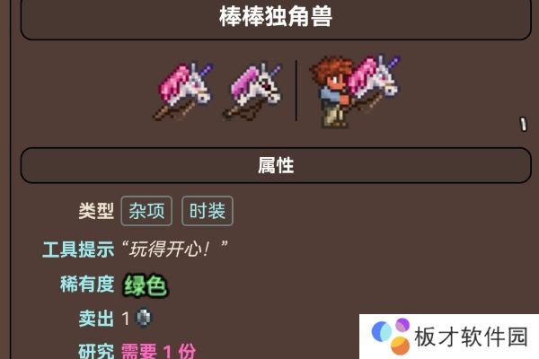 介绍:棒棒独角兽是个困难模式的小玩具物品,当选中时,它被固定在玩家面前,制造出骑着独角兽的错觉,它没有任何实际的功能,不同于独角兽坐骑。