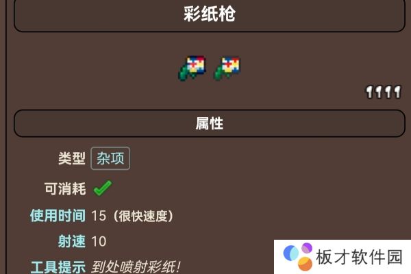 彩纸枪会受到增益、盔甲和配饰节省弹药效果影响。这可以使彩纸枪有几率不被消耗掉。