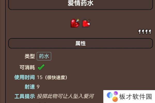 介绍:爱情药水是一种困难模式投掷药水,运作方式类似于投掷水瓶,但不会造成功能性效果。