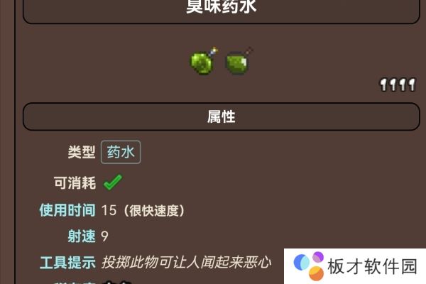 介绍:臭味药水是一种投掷药水,其操作类似于投掷水瓶,但不会产生任何功能性效果。