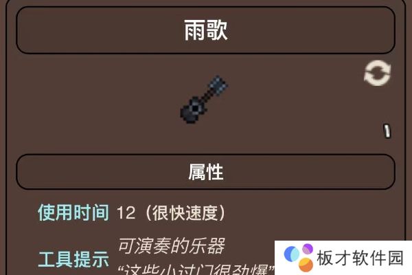 介绍:雨歌是一件小玩具乐器,它有1/100(1%)的几率由在雨天生成的飞鱼掉落,它可以奏出6种不同的和弦,取决于玩家拿着雨歌时光标距人物的远近。