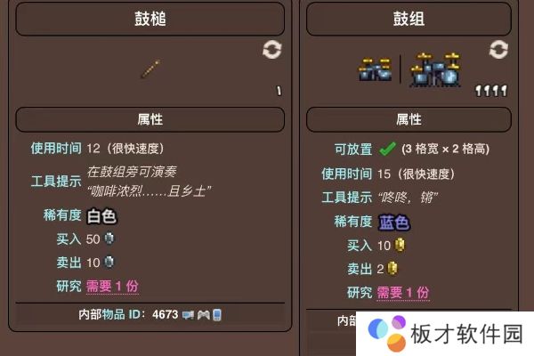 鼓组与鼓槌都可以从商人那里购买,在如下的Boss被打败后:世界吞噬怪、克鲁苏智之脑、骷髅王,亦或血肉墙。