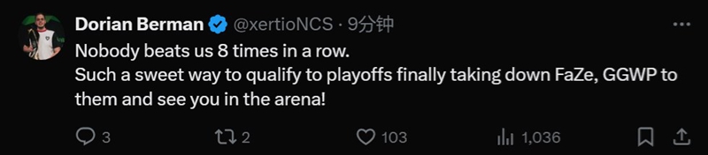 Dorian Berman | xertioN:“没有人可以连续八次击败MOUZ。终于击败了FaZe,而且还以如此甜蜜的方式晋级到了淘汰赛阶段。GGWP,竞技场见!”