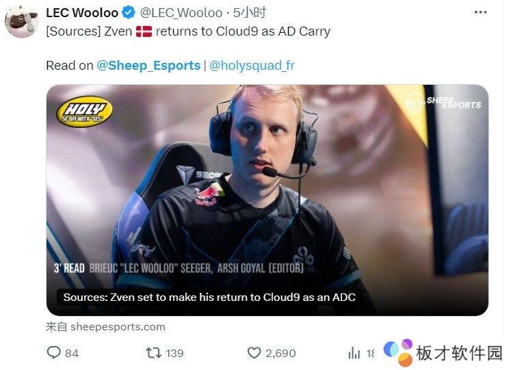 直播吧10月4日讯据外媒Sheep Esports报道,消息人士透露本赛季效力于DIG战队的AD选手Zven将回到C9并担任ADC位置。