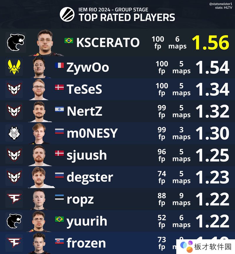 随着IEM 里约小组赛阶段的结束,有外媒统计出小组赛阶段的rating排行榜Top5,ZywOo被KSCERATO以仅0.02的微弱优势领先,而