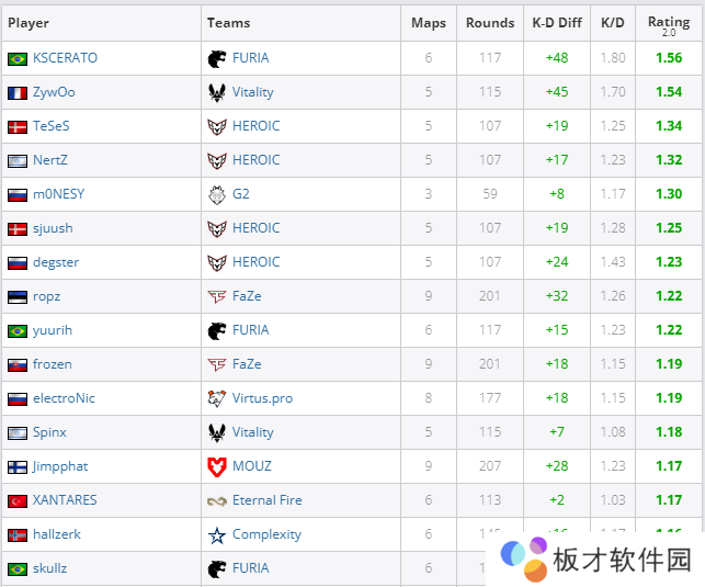 FURIA战队的KSCERATO以6张地图1.56 rating位居榜首,ZywOo紧随其后。