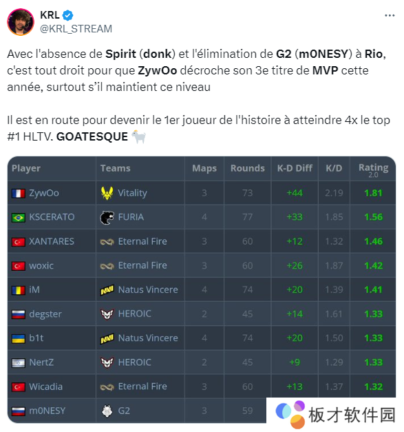 近日,法国知名爆料人,主播KRL在个人社交媒体账号上分享了自己对ZywOo争夺年度最佳选手可能性的看法。