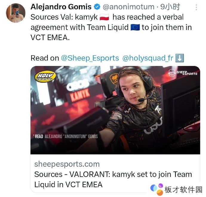 根据媒体人Alejandro Gomis消息,前Joblife选手kamyk与Team Liquid达成口头协议。在接下来的2025年,他将身披TL的战袍征战VCT 美洲联赛。