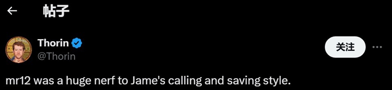日前分析师Thorin在社交平台上发布动态,他认为MR12是Jame指挥下降的原因之一。