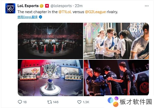 LoLesports官推分享了一组历年T1与G2在世界大赛相遇的赛场照片并配文:“T1和G2这对宿敌的新篇章!”