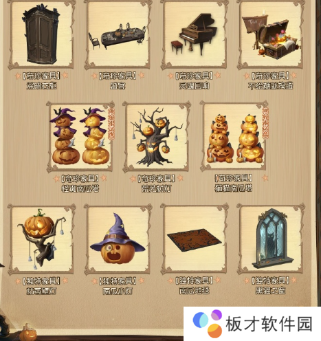 3、返场家具-奇珍家具:深暗衣柜、不给糖就捣蛋、灵魂回响、盛宴、怪诞南瓜塔、猫猫南瓜塔、荒芜树灯。