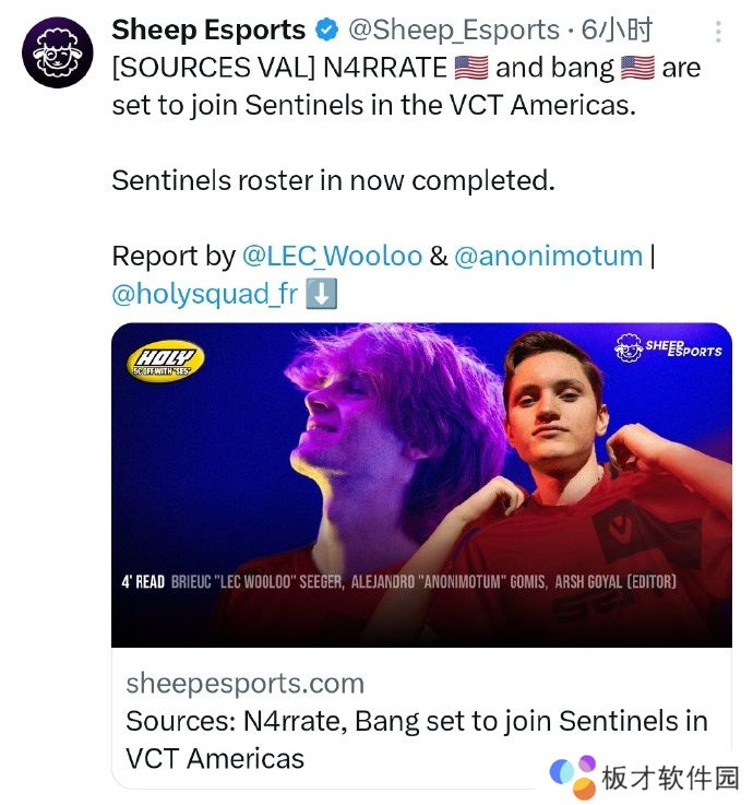 根据Sheep Esports消息,N4RRATE和bang即将加入Sentinels征战VCT美洲,Sentinels的阵容组建完成。