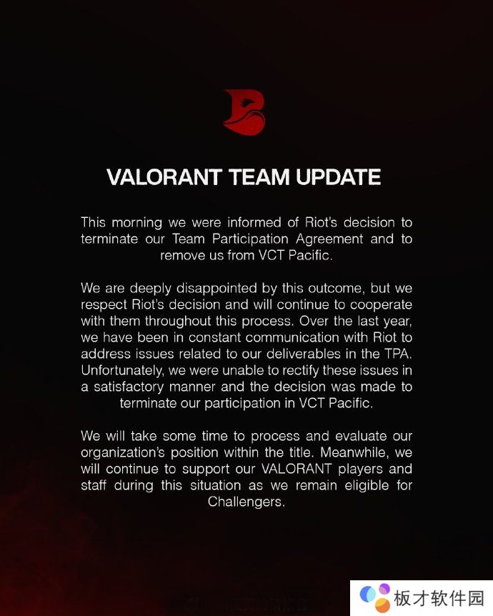我们被告知拳头公司决定终止与我们俱乐部的参赛协议,并将我们从VCT Pacific中移除,我们对这个结果感到非常失望,但我们尊重拳头公司的决定。