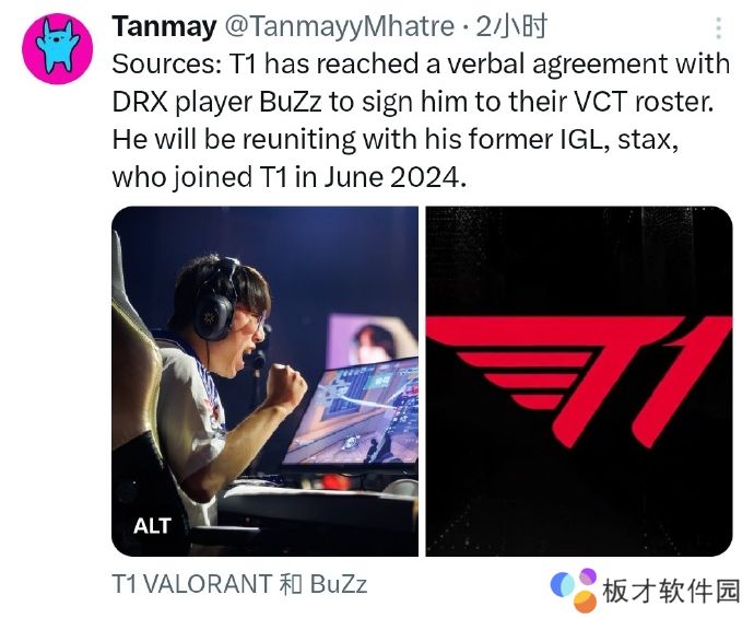 根据媒体人Tanmay消息,T1战队已经与DRX选手BuZz达成口头协议,后者将加入他们的VCT阵容。他将与他的前指挥stax重聚。